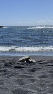 Our next stop after our bellies full with donuts was to the Panaluu Black Sand Beach, where we were able to walk along where lava once met the ocean, where to our surprise they also had a few sea turtles who were making their way from the sea into land. Down a ways there we a ton of families spending their day at the beach, it was definitely a different experience from the normal white sand beaches that we are used to. Although when in Iceland we also visit a beach that was black, but those were more stones than sand. After enjoying sometime walking along the black sand beach and some large lava rock, we made our way back to our luxury Mercedes van, and off to what I was anticipating was going to be the most exciting stop of the day, Hawai’i Volcanoes National Park. We arrived and were treated to a lunch from Stephen that consisted of rice, teriyaki chicken, fried fish, and the remainder of our donuts from our earlier stop, which was a good call to save. Once we had finished our lunches, we ventured into the park store to get my stamp for my National Parks passport book and then made our way over to the Volcano House, which was a combination of a hotel, restaurant, gift shops and a viewing platform for the volcano. Up until the day prior to our arrival, it was active and you could see lava erupting from the top, unfortunately during our visit there was no active lava, but there was plenty of smoke coming up through it, and is smelled of sulfur. After we were done viewing the volcano at that point, Stephen drove us down to the lava tube, where we were able to take a short hike down and make our way through where once lava flowed. Seeing all of the lava during our drives, walking through the lava tube, it’s crazy to think that people inhabit this island and at any minute destruction could happen to their lives and homes (but I guess that really could be anywhere given Mother Earth).